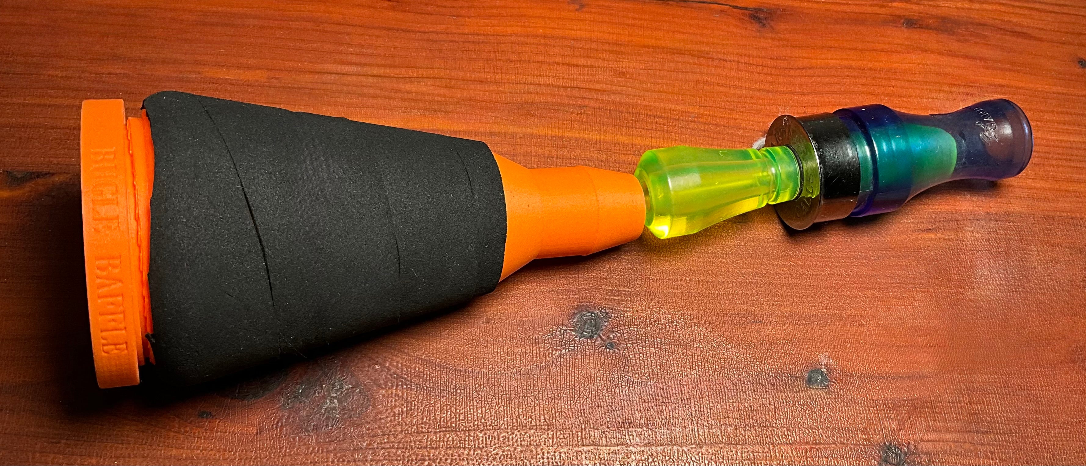 Not all hero’s wear capes! The Bugle Baffle is here to save your marriage, relationship, friendships and end family feuds! It silences bugle tubes, goose calls, cow elk calls, duck calls,and even diaphragm calls to practice!
